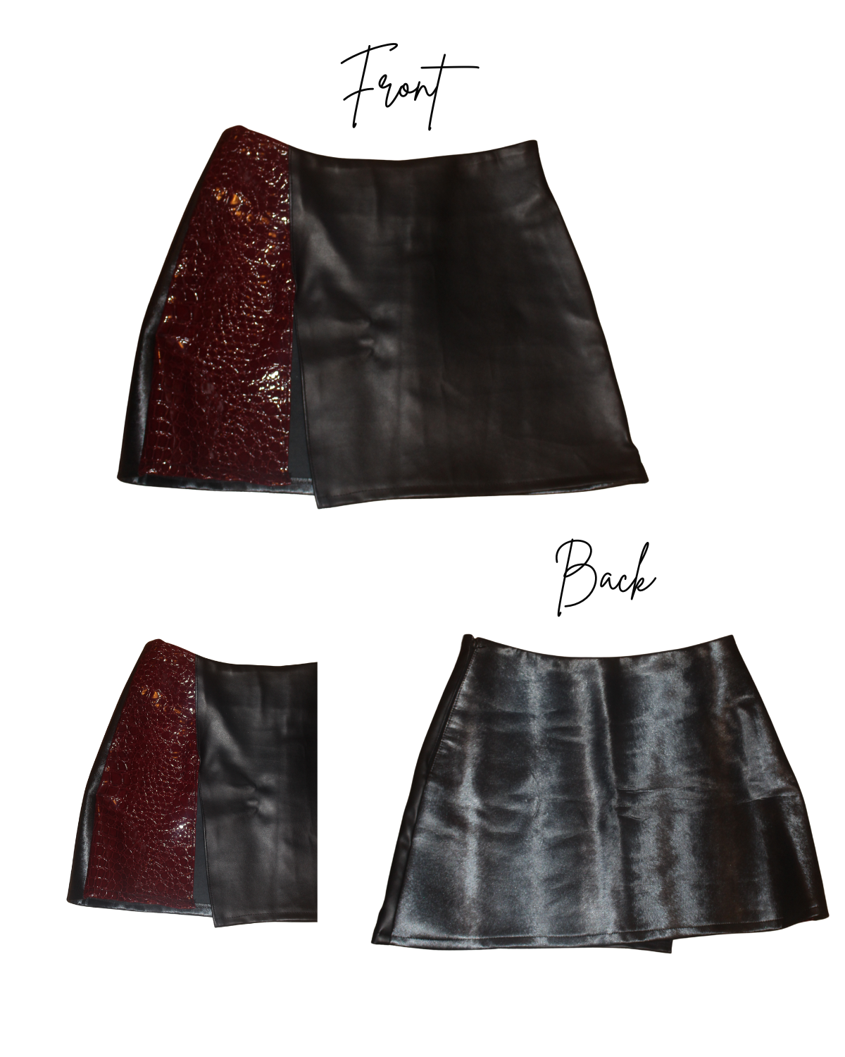 A one-of-one mini skirt constructed from reclaimed fabric scraps, combining smooth black leather with a deep, textured contrast panel. Designed with an asymmetrical front and clean back finish, this piece plays with tension between softness and structure.