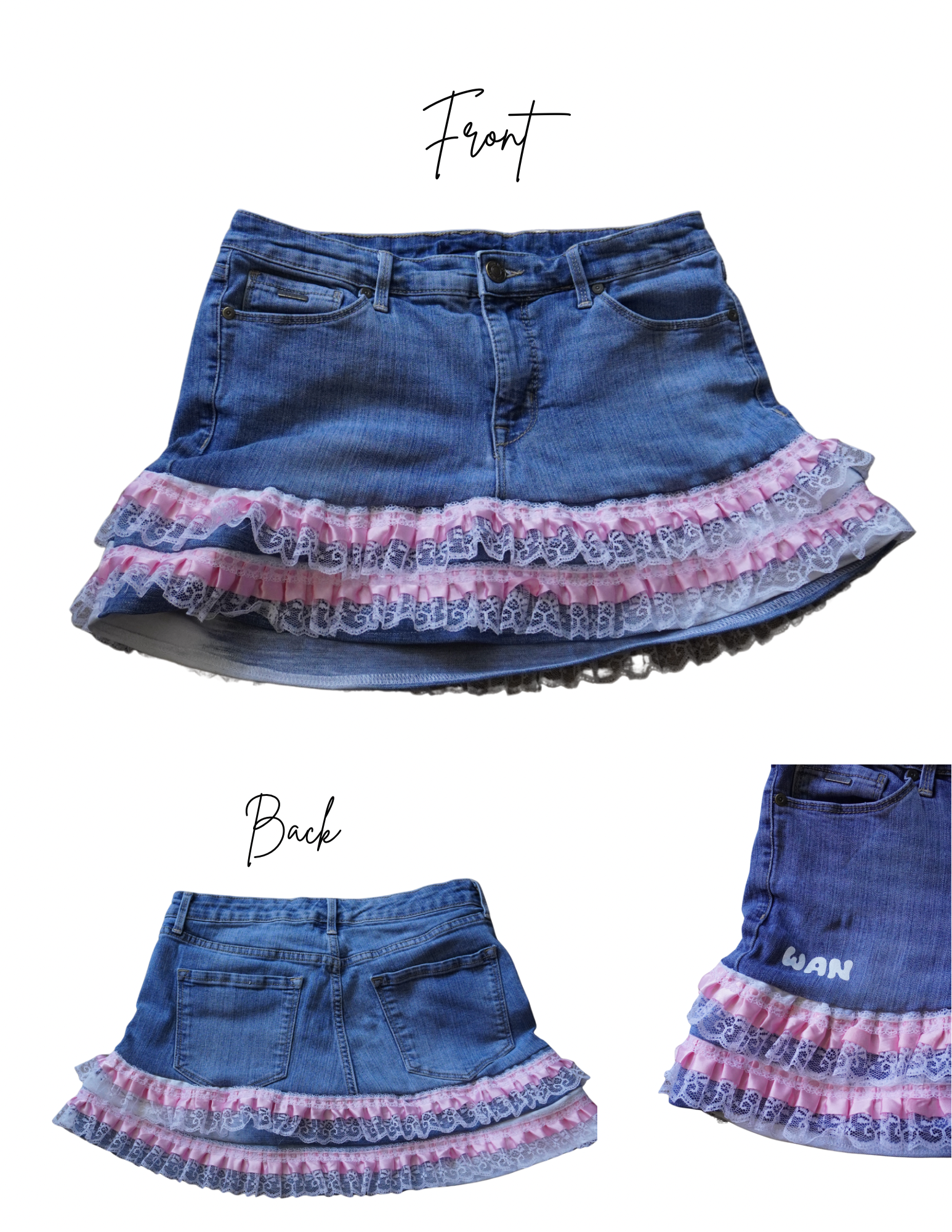 A nostalgic silhouette reimagined through a WAN lens. The Baby Doll Denim Ruffle Skirt features upcycled denim finished with layered pink ribbon and lace ruffles for a soft yet playful contrast. Designed to sit comfortably on the waist with a flattering mini length, this piece blends sweetness with edge — perfect for statement styling.